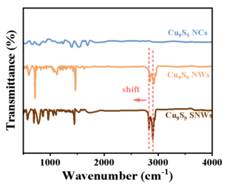 No espectro FT-IR de SNWs de Cu9S5, como mostrado na Figura 3, um fenômeno significativo de desvio para o vermelho foi observado em comparação com Cu9S5 NWs, indicando a interação eletrônica entre Cu e S. Os picos característicos das amostras de Cu9S5 NWs e Cu9S5 SNWs em 2.916 cm-1 e 2.846 cm-1 podem ser atribuídos ao modo de vibração de estiramento do metileno (-CH2-) em dodecanotiol, enquanto a característica o pico em 1471 cm-1 corresponde ao modo de vibração de flexão da ligação CH.