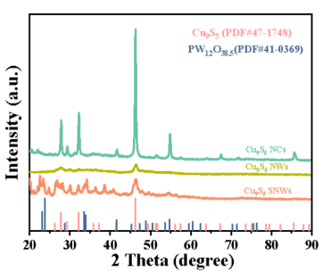 A largura de meio pico do plano de cristal Cu9S5 SNWs (001) é significativamente maior que a das outras duas formas de amostras. De acordo com a fórmula de Scherrer, quanto menor o tamanho do grão, maior será a largura correspondente do meio pico do pico de difração. Pelo contrário, quanto maior o tamanho da partícula, mais nítida será a meia largura do pico de difração. Devido ao tamanho da escala subnanométrica (0,95 nm) da amostra de SNWs Cu9S5 e ao fato de a amostra exibir uma estrutura unicelular sem um plano cristalino completo, a largura do meio pico é significativamente maior, enquanto a largura do meio pico (001) dos SNWs Cu9S5 é maior.
