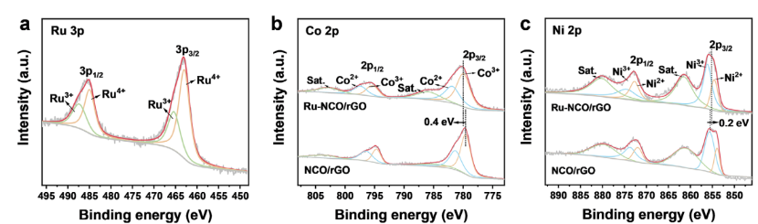 A tecnologia XPS pode analisar profundamente a composição elementar, os estados químicos e a estrutura eletrônica das superfícies do catalisador. Quando a superfície do catalisador é irradiada com raios X, os elétrons dos átomos da superfície são excitados. Ao detectar a energia e a quantidade desses fotoelétrons, podemos determinar o tipo e o conteúdo do elemento, bem como o ambiente químico em que o elemento está localizado. Por exemplo, ao estudar catalisadores metálicos suportados, o XPS pode determinar com precisão a forma do metal na superfície do suporte, se é um elemento metálico ou um óxido metálico, e as mudanças em seu estado de oxidação. Isto é muito importante para a compreensão da atividade e do mecanismo de desativação do catalisador. Conforme mostrado na Figura 5, o XPS foi usado para demonstrar a composição e os estados de valência dos elementos Ru, Co e Ni. Os espectros finos XPS de elementos específicos da amostra foram utilizados para determinar o deslocamento positivo/negativo da energia de ligação, indicando a existência de interações eletrônicas.