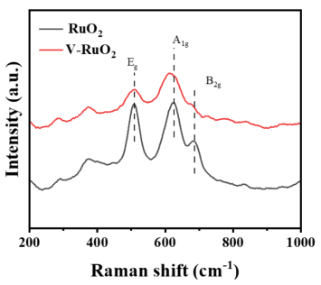 Como mostrado na Figura 4, o espectro Raman de V-RuO2 (RuO2 dopado com V) é consistente com o de RuO2, sem outros picos únicos, excluindo a geração de V2O5. A dopagem V muda o modo A1g do RuO2 para números de onda mais baixos, indicando que a introdução de V afeta significativamente sua estrutura de rede e ambiente de ligação química (o que pode resultar em vacâncias de oxigênio ou defeitos locais), alterando assim sua estrutura eletrônica; O deslocamento para a esquerda do pico A1g reflete a interação entre os átomos de V e a rede de RuO2, indicando que a dopagem de V modula a simetria local e as características de comprimento de ligação do RuO2.